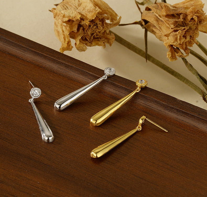 These elongated teardrop earrings shimmer with a cool, glassy brilliance that catches the light from every angle. Their sleek, flowing silhouette adds a refined edge—perfect for creating a striking, modern statement.