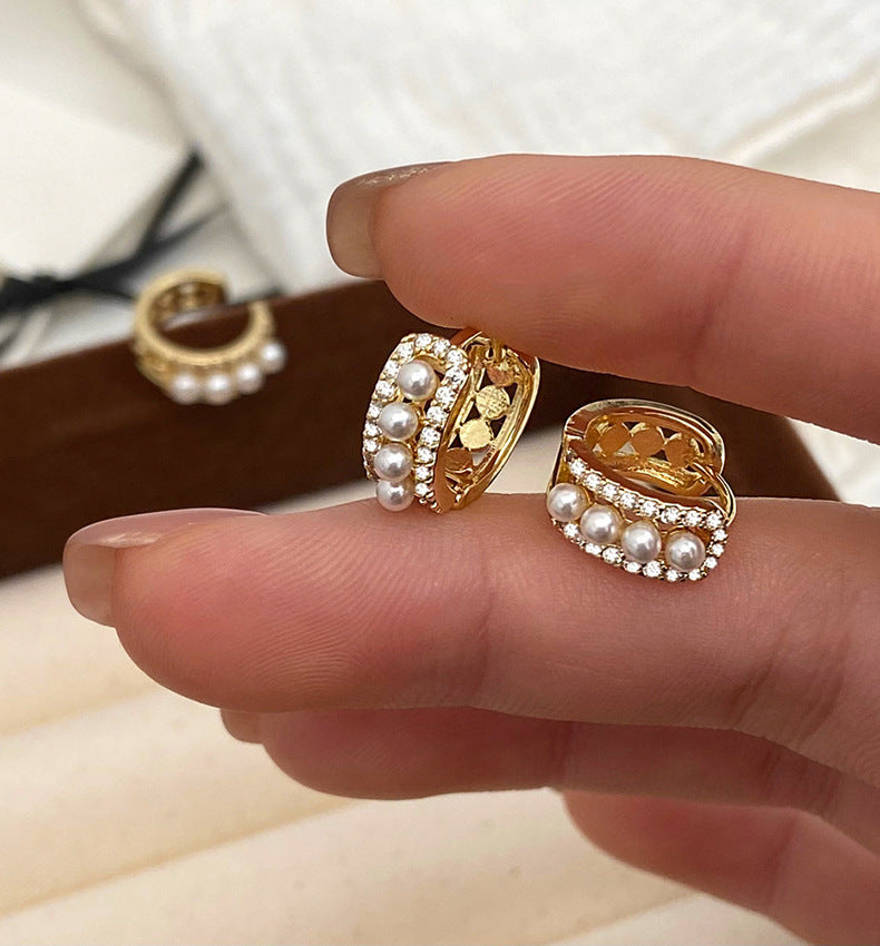 A captivating play of light and form, these earrings feature glossy shell pearls suspended within sleek hoops for a touch of sculptural charm. Their gentle iridescence and fluid curves bring a refined balance of minimalism and allure to any look.