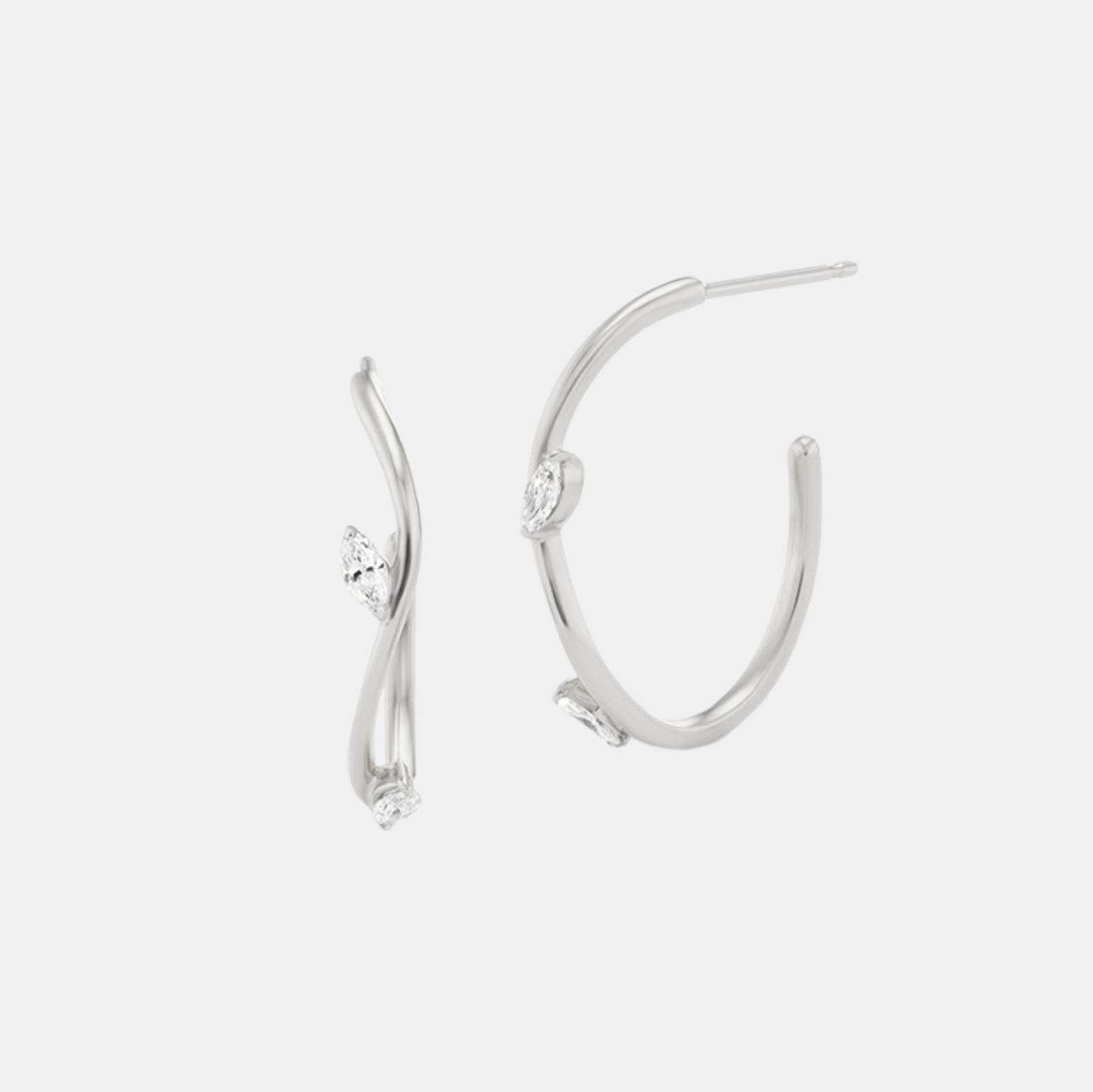 These open hoop earrings feature a graceful, wavy silhouette that flows effortlessly around the ear. Two pear-shaped accents add a refined sparkle, enhancing the earrings’ sculptural and modern appeal.