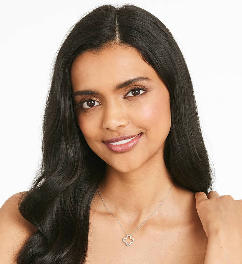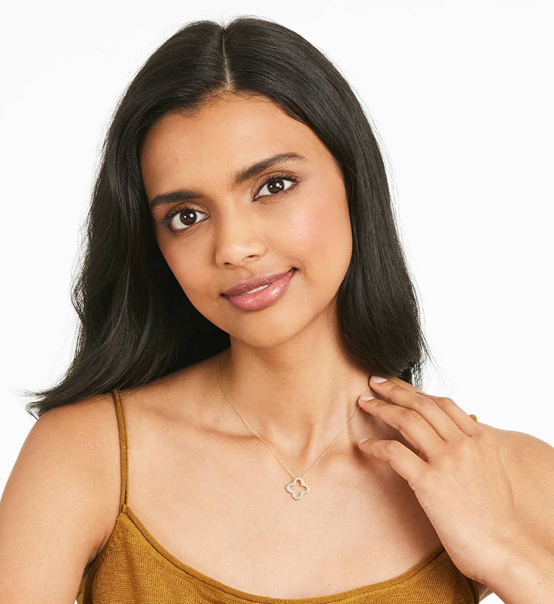 This necklace features a floating four-leaf clover motif that seems to dance with the light. Its airy, sculptural design adds a touch of whimsy while maintaining a sleek, sophisticated look.
