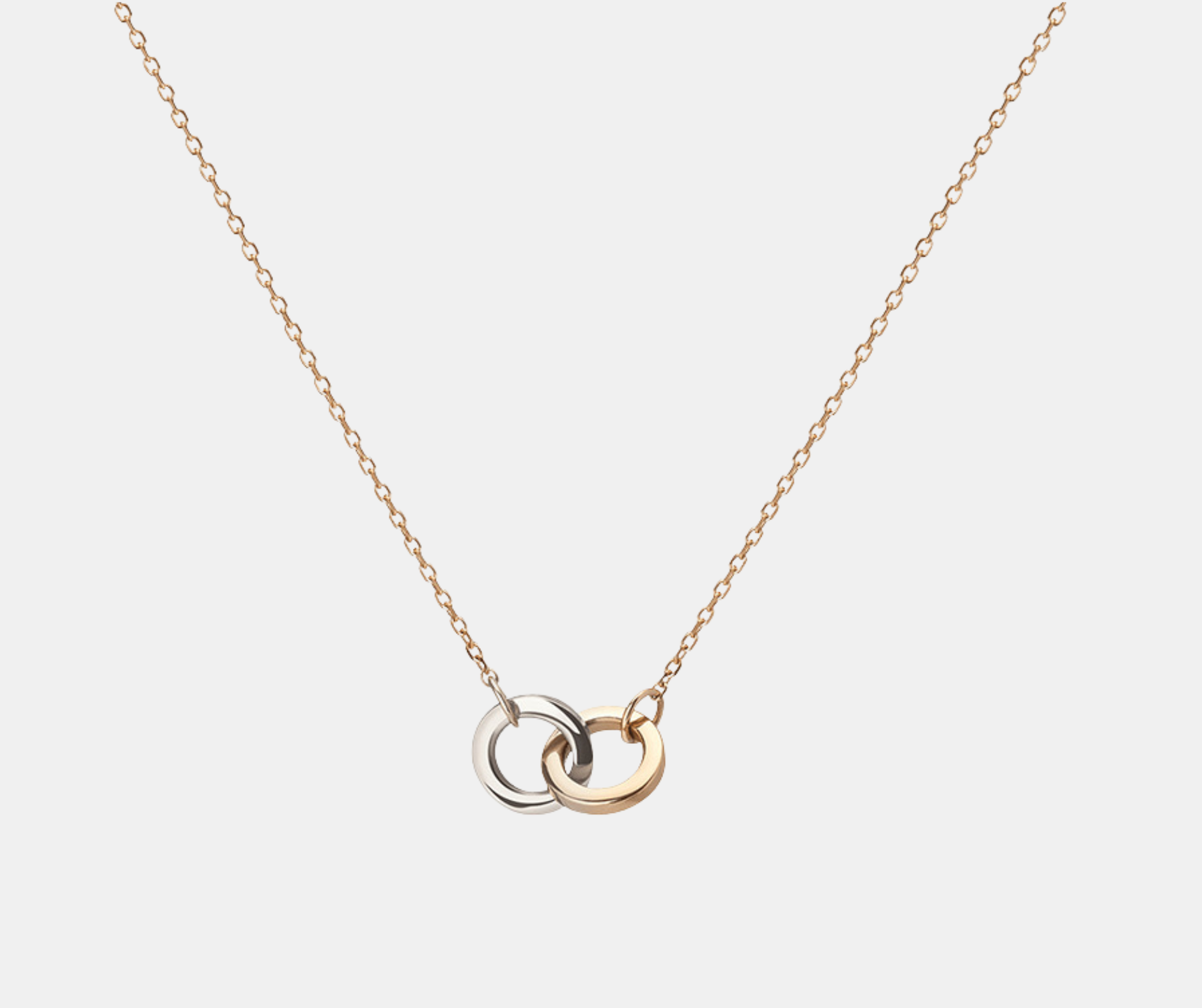 This necklace draws the eye with its sleek interlocking design, offering a modern twist on classic style. Its polished lines and subtle shine make it a striking accent for any outfit, effortlessly elevating everyday looks.