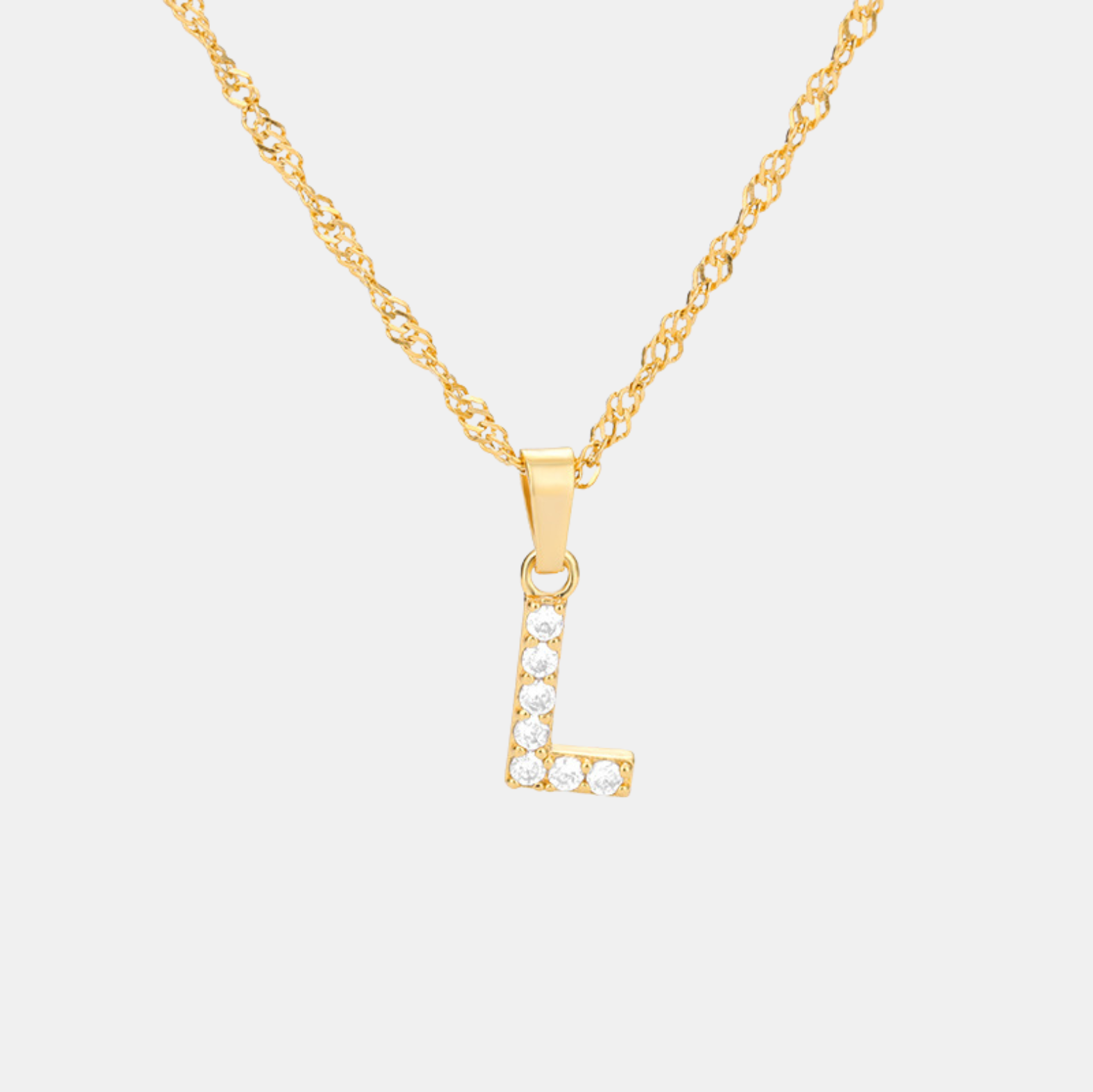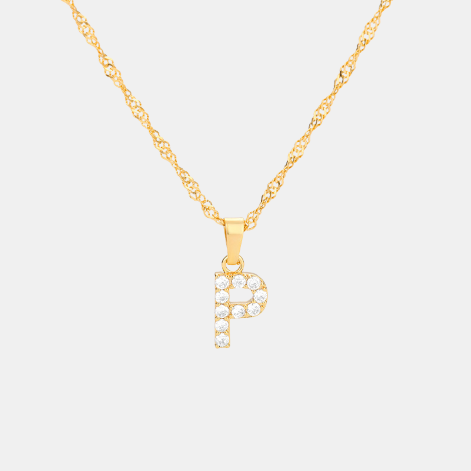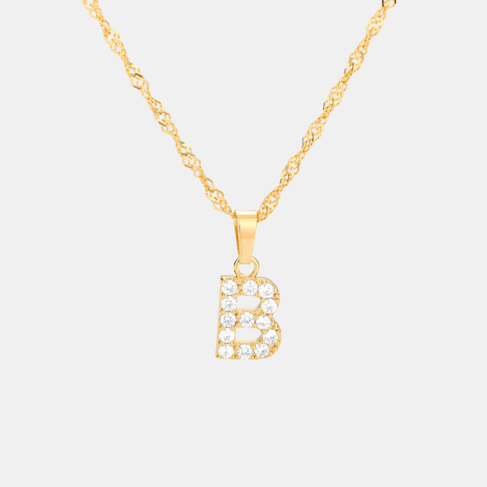 A fine twisted chain holds a bold letter pendant outlined in radiant stones that glint with subtle movement. Each initial catches the light like a whispered sparkle — a personal accent that adds quiet confidence to any look.