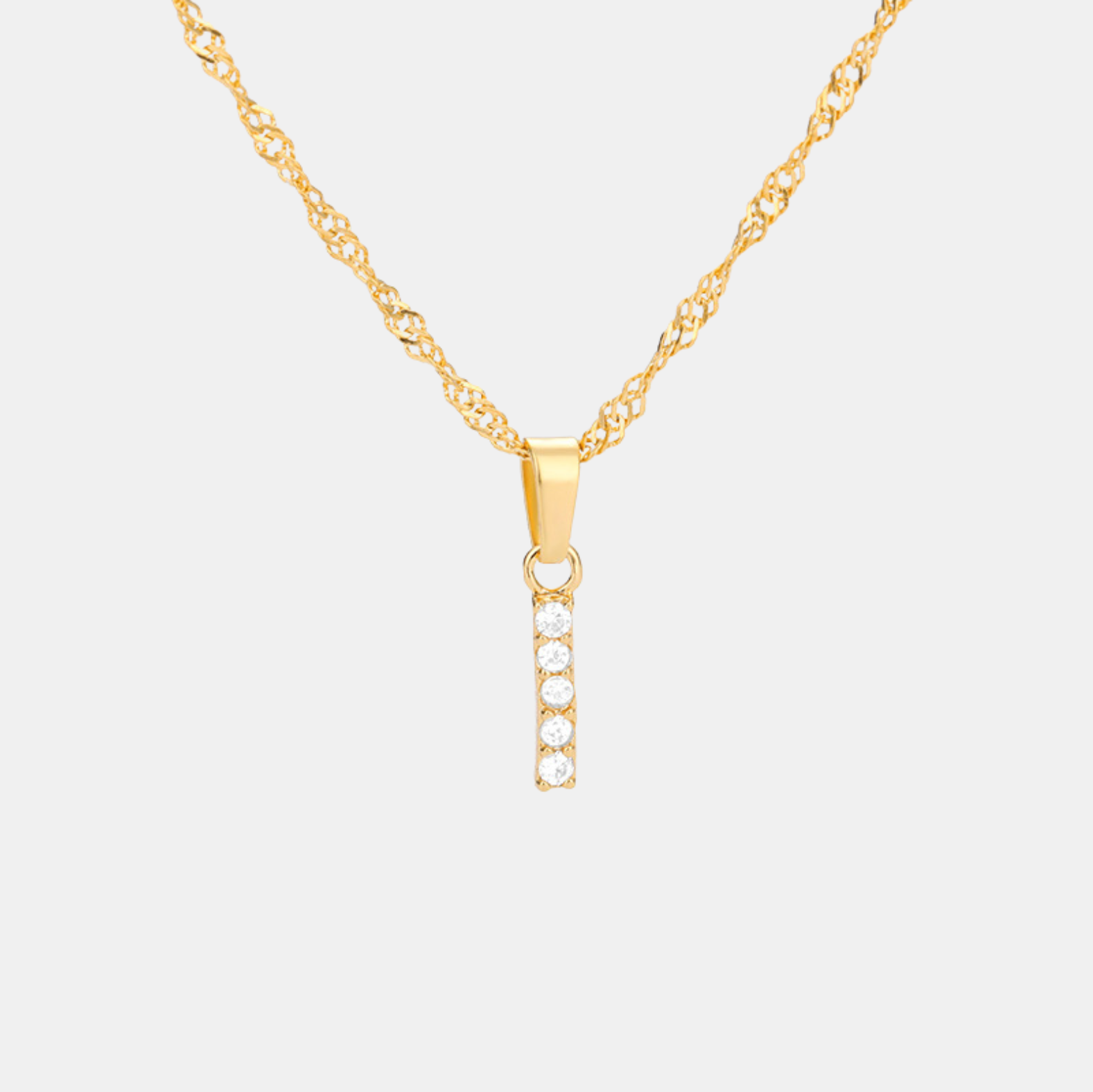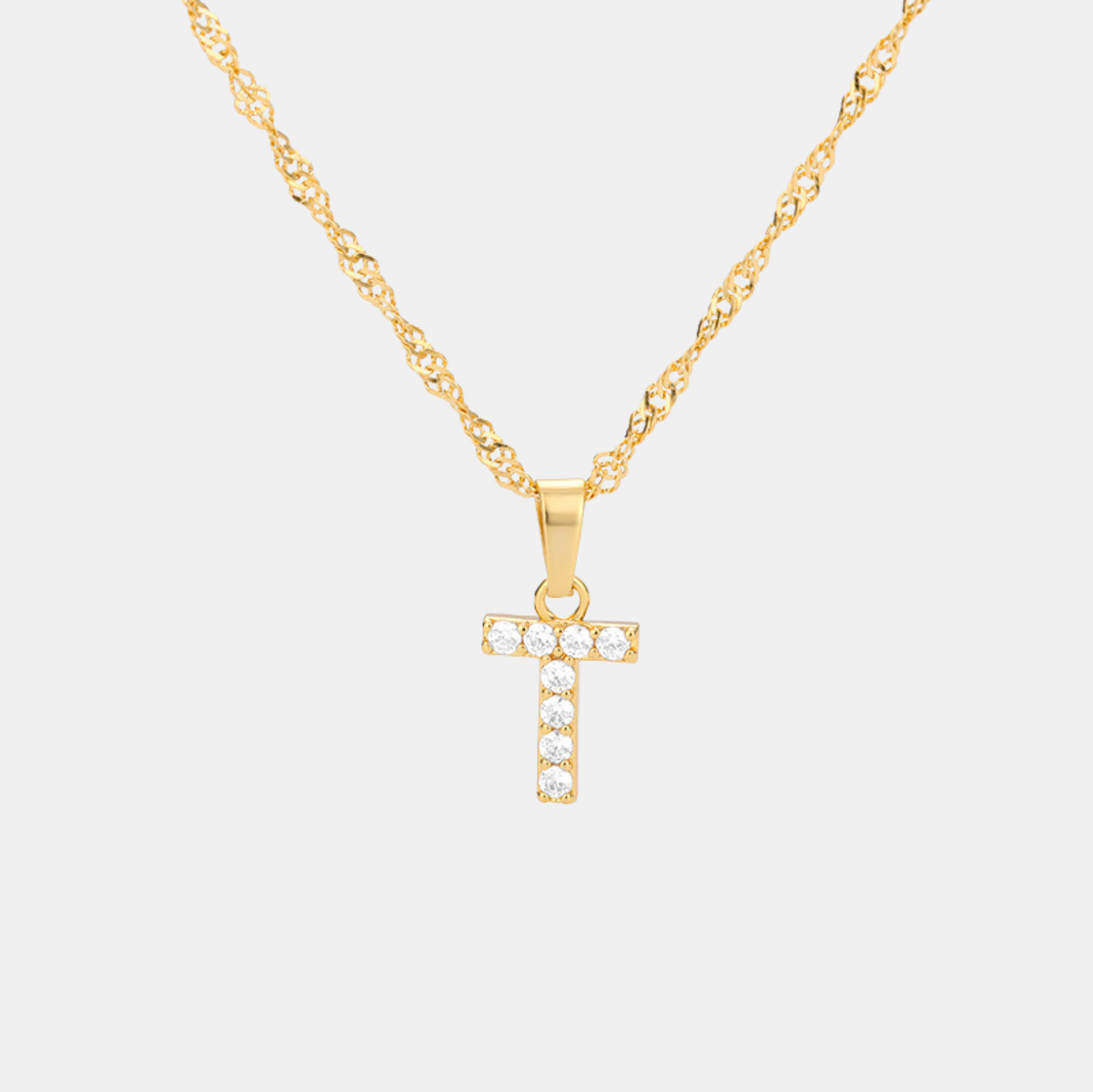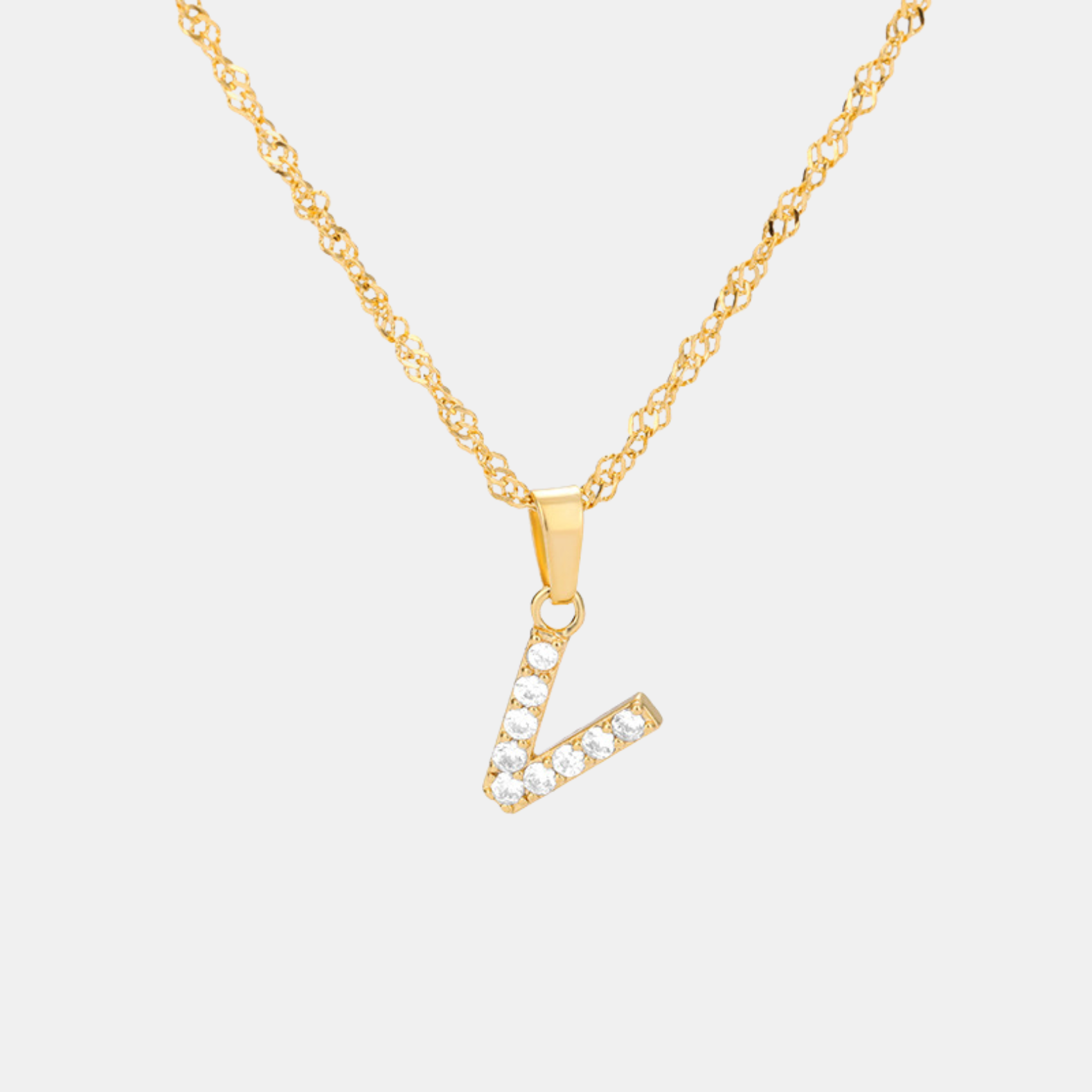 A fine twisted chain holds a bold letter pendant outlined in radiant stones that glint with subtle movement. Each initial catches the light like a whispered sparkle — a personal accent that adds quiet confidence to any look.