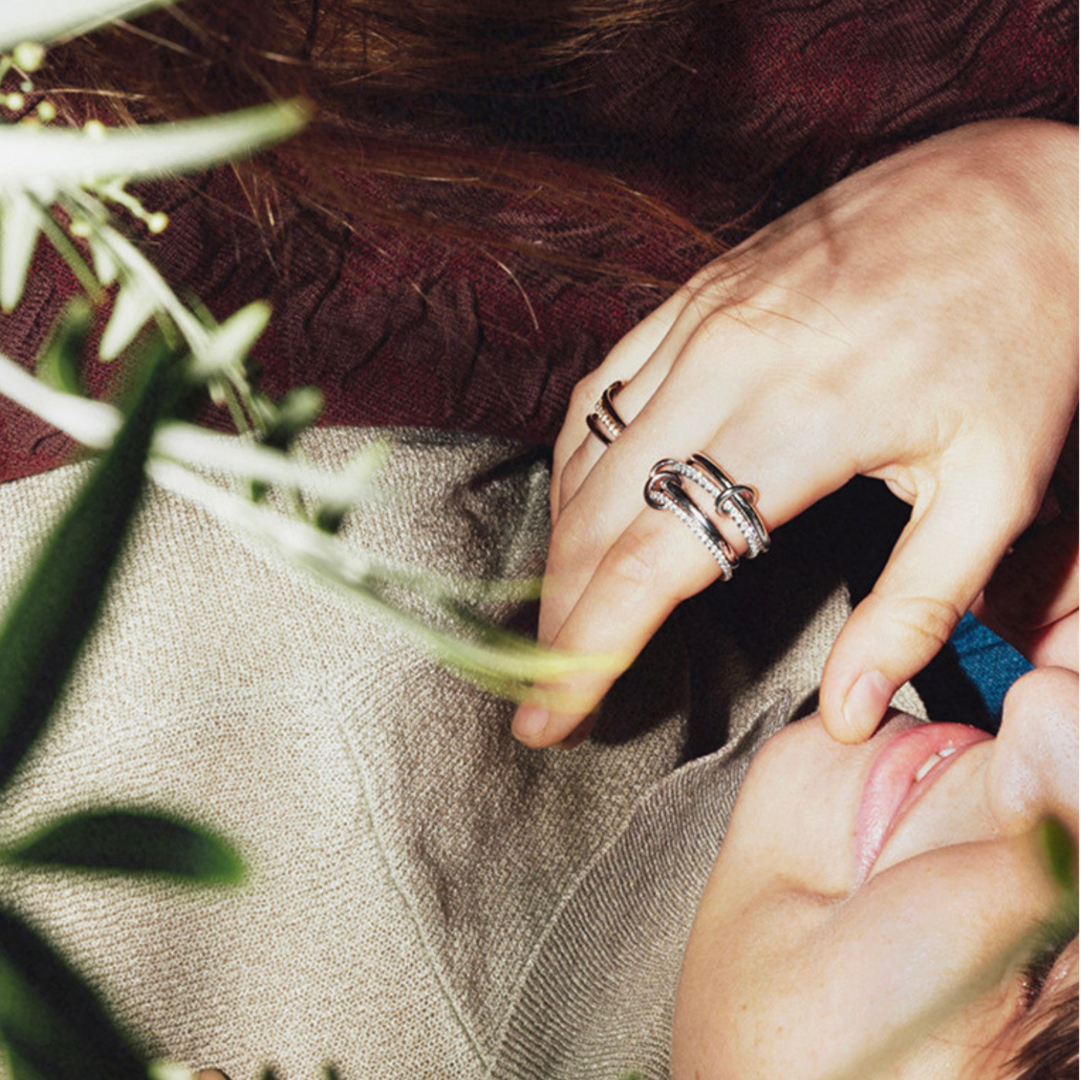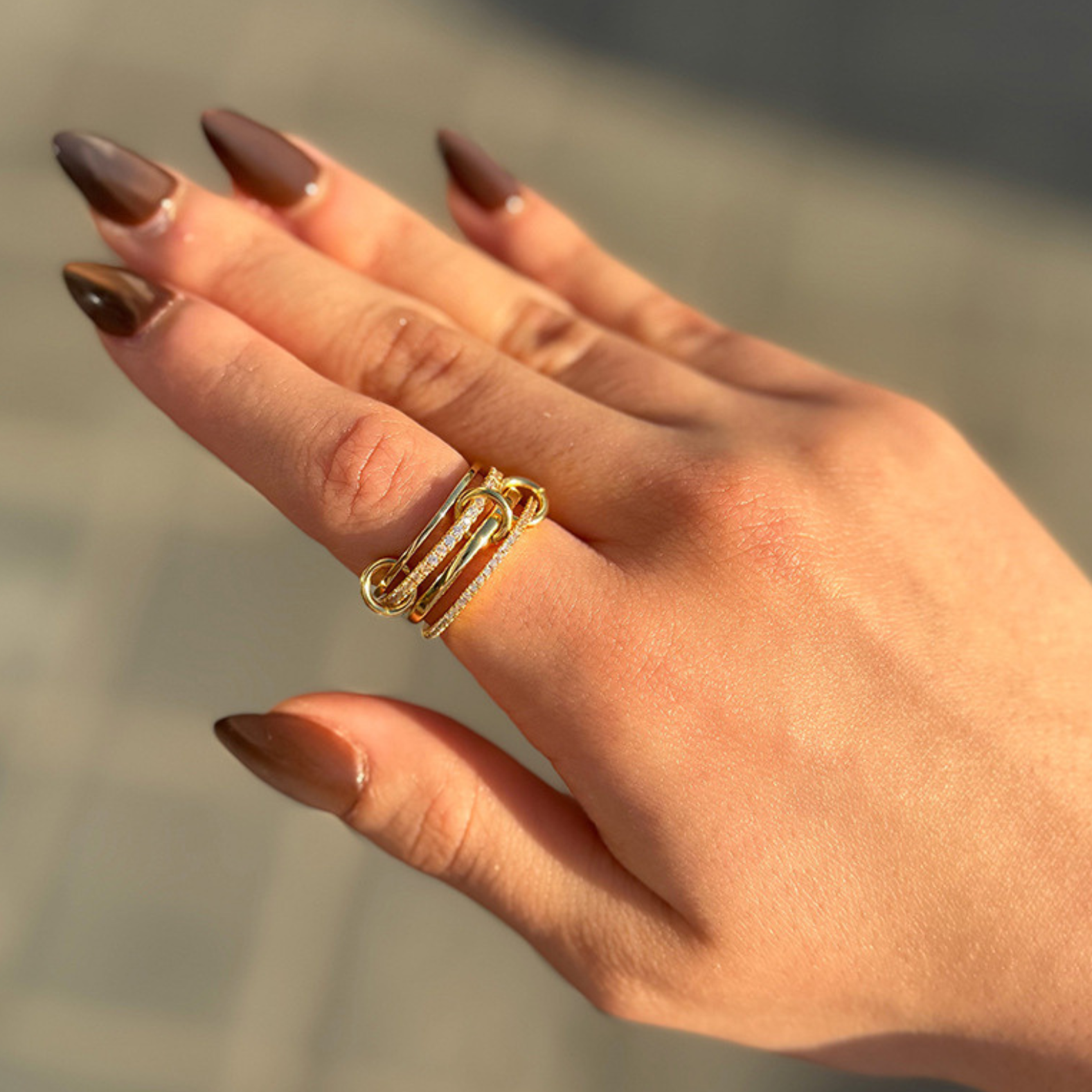Make a modern statement with this unique four-ring interlocking diamond design, featuring two sparkling pavé bands contrasted by two smooth, polished bands for a striking, cohesive look. Its intertwined structure symbolizes connection and strength, making it a meaningful piece that can be worn alone or stacked for a bold, curated style.
