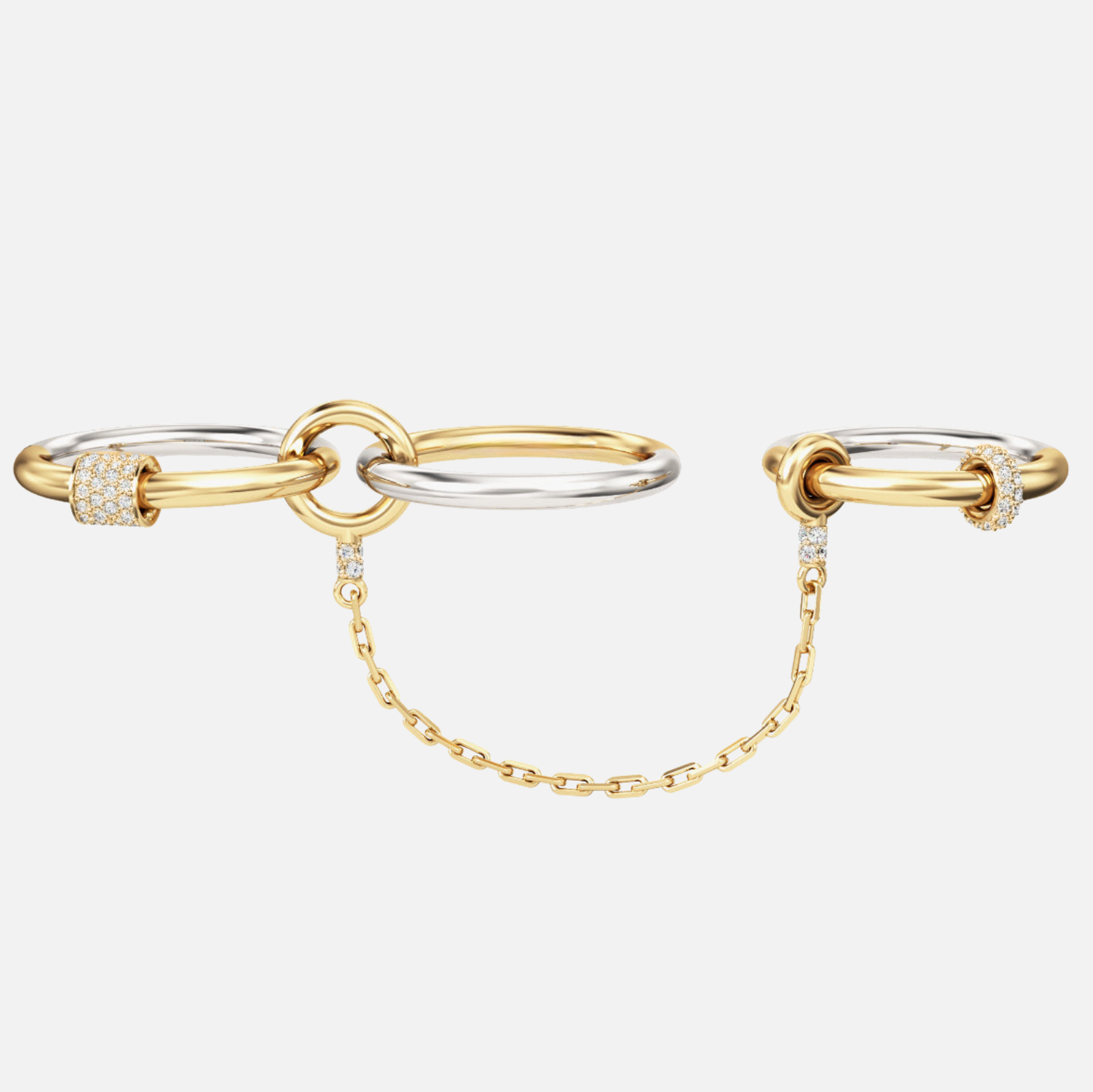This ring features a bold interlocking chain design accented by a mix of polished tones for a modern, layered look. The intricate detailing catches the light beautifully, adding texture and depth to any style.