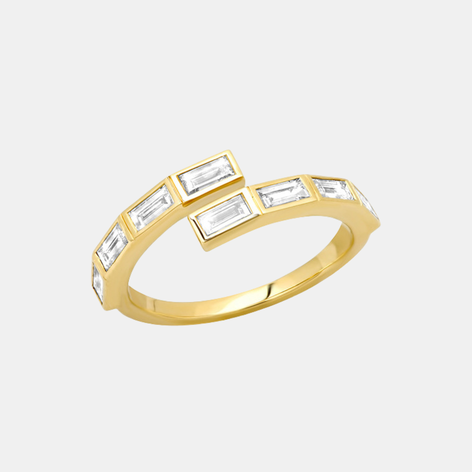 This ring showcases a graceful bypass design where two sleek bands sweep past each other, meeting in a line of radiant baguette stones. The structured arrangement and open form create a modern, sculpted look with luminous symmetry.