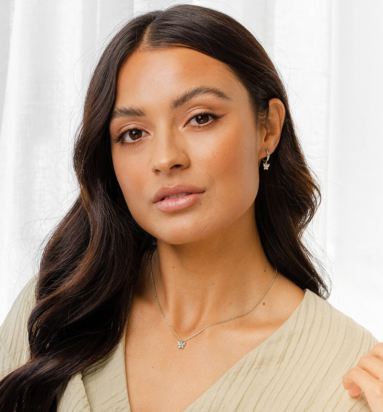 This necklace features a graceful butterfly pendant adorned with glimmering stones that catch the light with every turn. Its delicate outline and airy form bring a sense of movement and charm, adding a soft yet striking accent to any neckline.